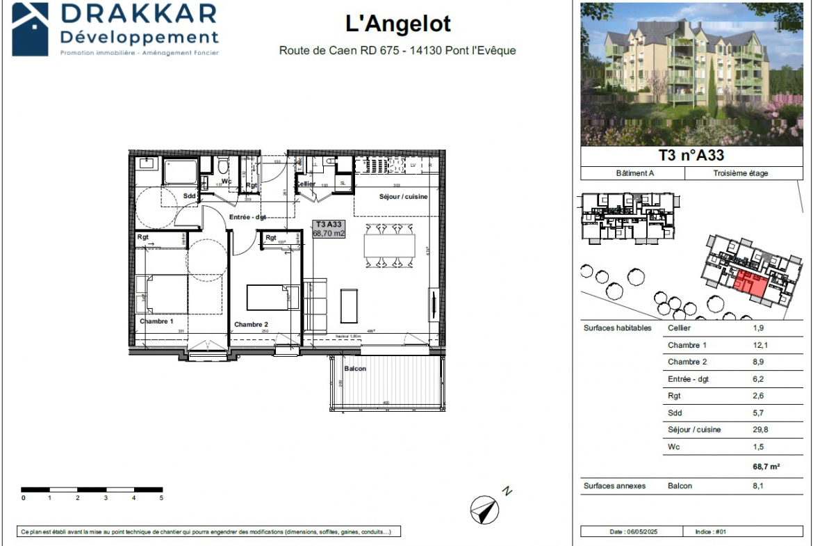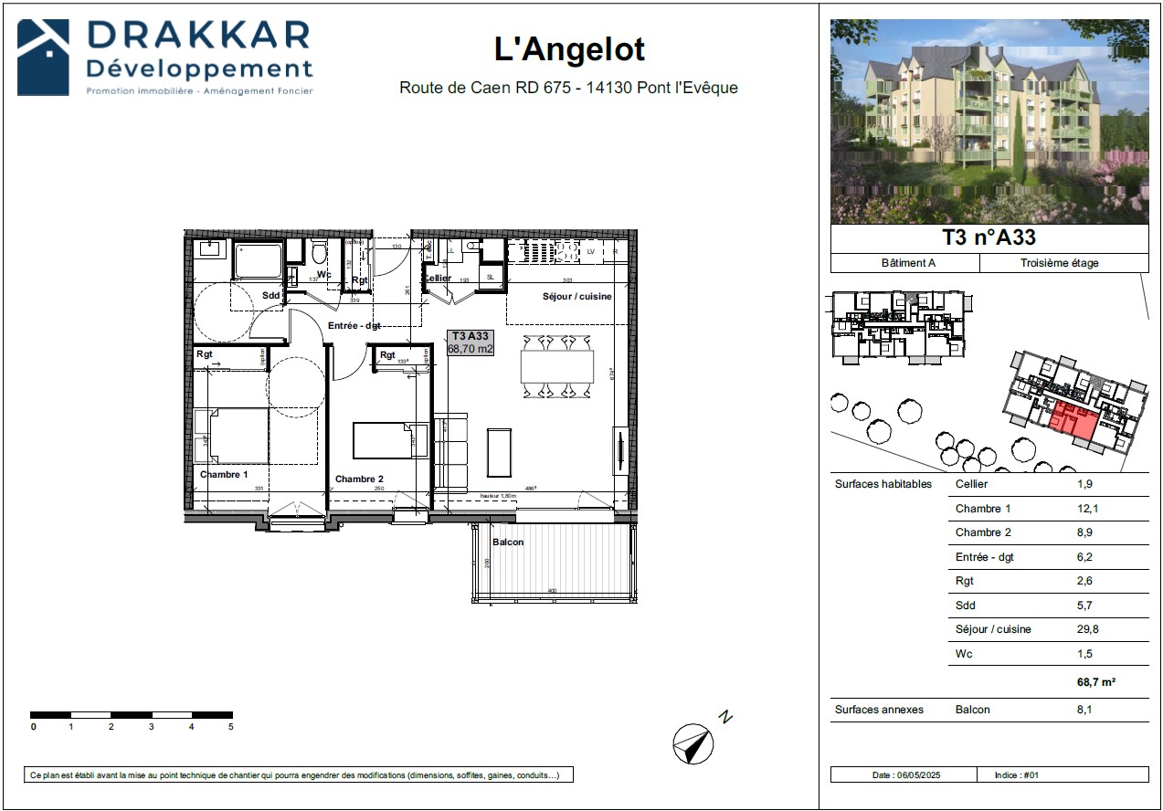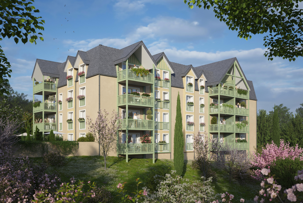 Jérôme Mesnildrey Immobilier vous propose ce T3 neuf de 68 m² au 3ème étage avec ascenseur de la résidence L’Angelot, un programme moderne au style néo-normand, situé à deux pas du centre historique et à 10 minutes de Deauville.